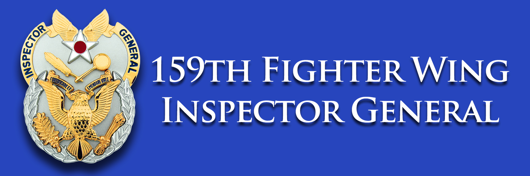 The 159th Fighter Wing Inspector General (IG) handles issues affecting the discipline, readiness and warfighting capability of our Airmen.  This includes executing a complaint resolution process.  The IG is also responsible for educating members of the organization about IG processes and Fraud, Waste and Abuse (FWA) issues.  The governing directive of the IG Complaints Resolution Program is Air Force Instruction 90-301, "Inspector General Complaints Resolution".  Under this directive, military and civilian employees of the 159th Fighter Wing have a duty to promptly report: